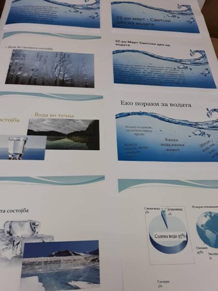 Одбележување на,,Светскиот ден на водата ” 22-ри Март со активно учество на нашите ученици кои преку сликање,пораки,презентации и истражување ни покажаа дека водите се од непроценливо значење за сите нас и дека треба да се грижиме за нив.Одговорни наставници: Маја Чубриновска и Виолета Тодоровска.